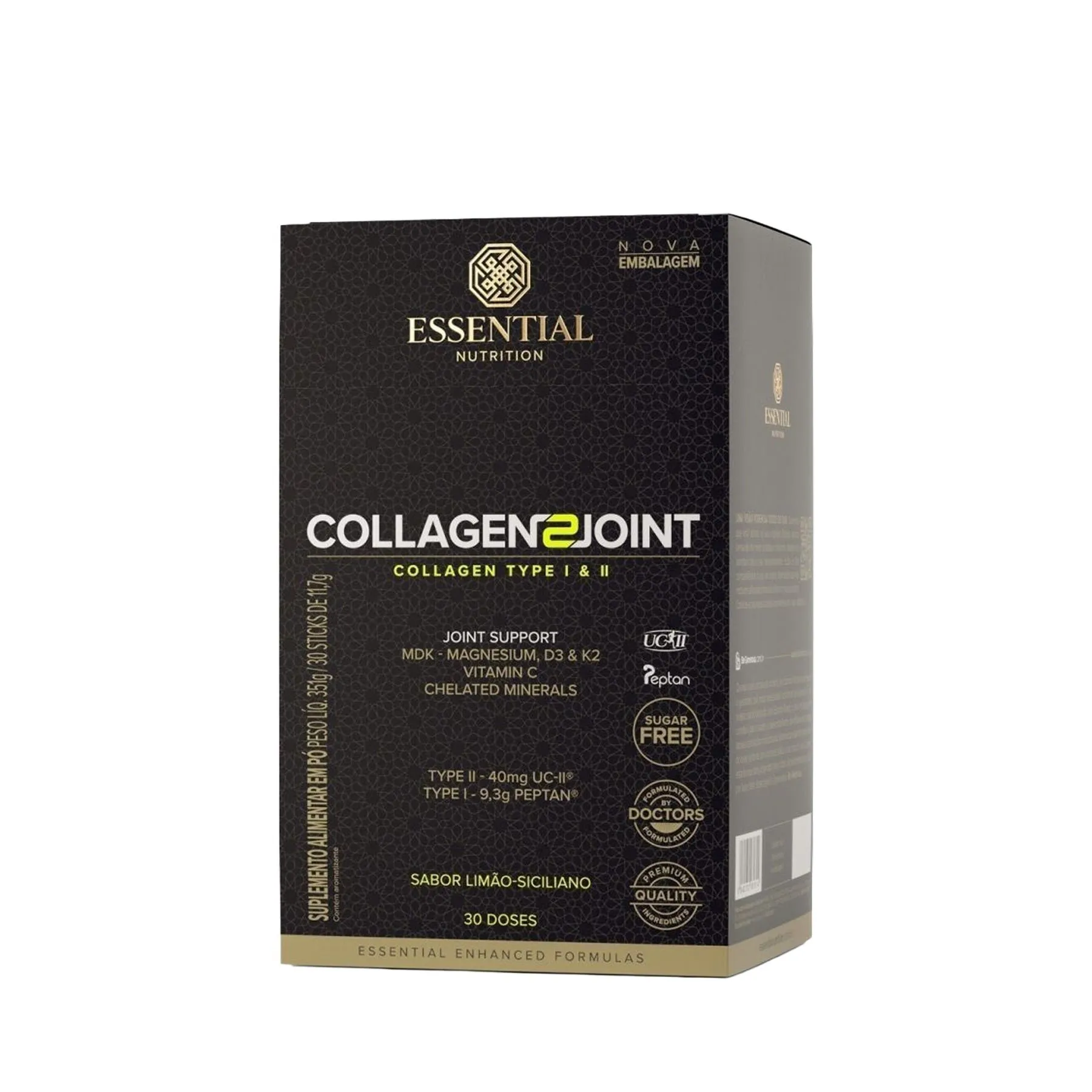 Collagen 2 Joint da ESSENTIAL é uma solução única e completa que une o colágeno tipo II não desnaturado (UC-II™) com peptídeos de colágeno tipo I (Peptan®), combinada às vitaminas C, D e K e aos minerais magnésio, manganês e zinco.Uma fórmula muito bem articulada, com ingredientes e matérias-primas escolhidas por uma equipe multidisciplinar que envolve médicos, farmacêuticos e nutricionistas. Agora você pode 60% da cartilagem presente na extremidade do osso é constituída de colágeno tipo II. Essa região funciona como uma almofada, evitando o contato e atrito entre os ossos. Ingredientes muito bem articulados Nenhum ingrediente é por acaso, e todos juntos — colágeno Tipo I e II (UC-II™), com as vitaminas C, D, K2, magnésio, manganês e zinco — constroem o resultado final.